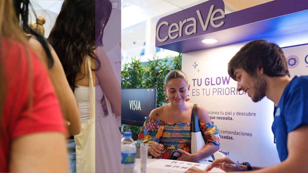 Estaciones interactivas de CeraVe, La Roche-Posay y Vichy, con orientación personalizada, pruebas de productos y recomendaciones de rutinas de cuidado.